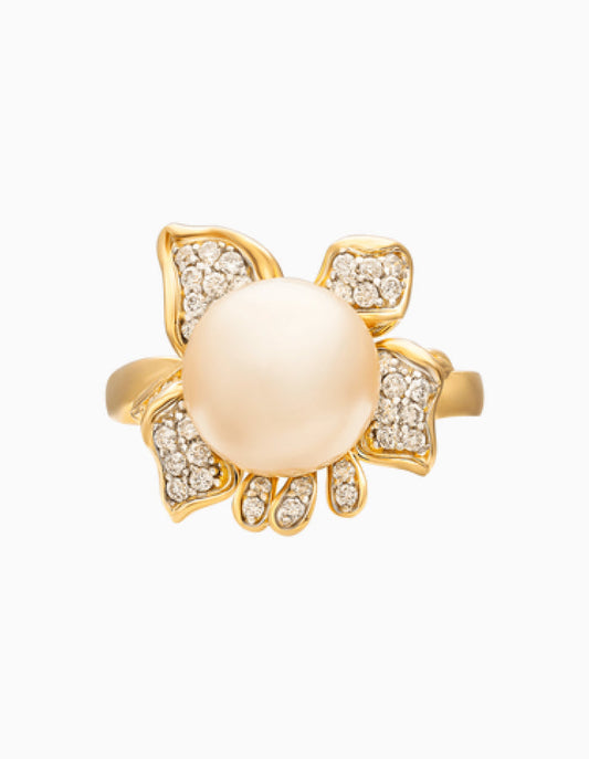 Golden South Sea Pearl Daffodil Flower Ring with Diamond Petals