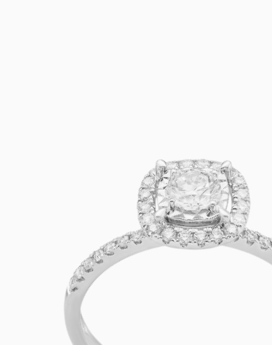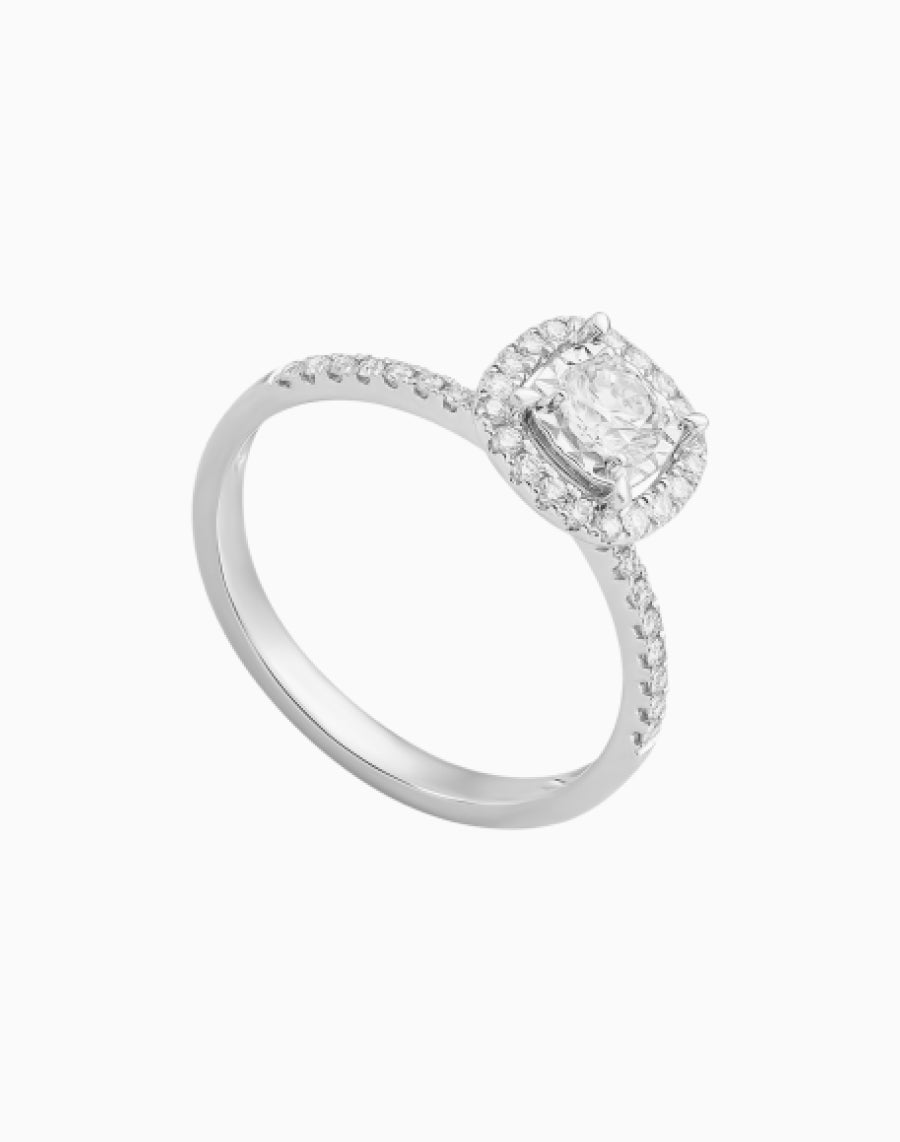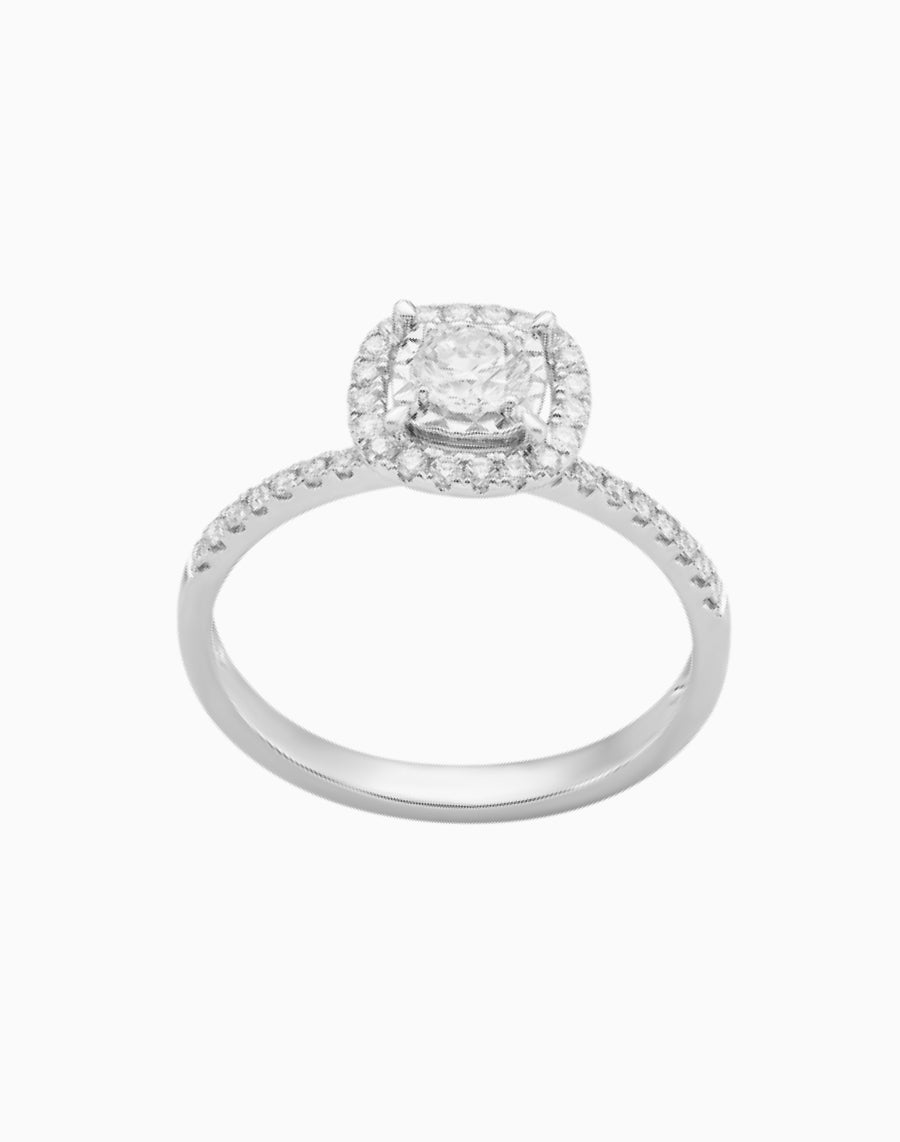 This is the ideal sparkling engagement ring to celebrate the start of your shared future. It has a total carat weight of 0.50ct, with a 0.30ct centre stone and 0.20ct of side stones, all in Round Brilliant shape. You can also get a matching wedding band.