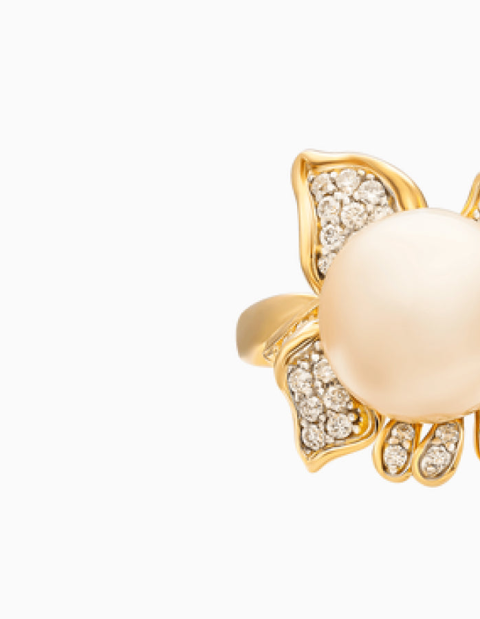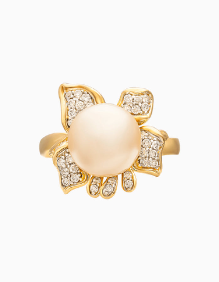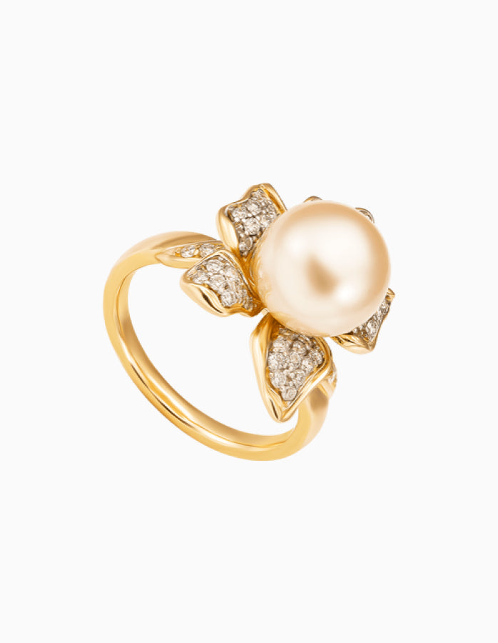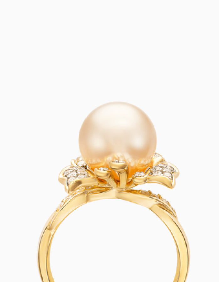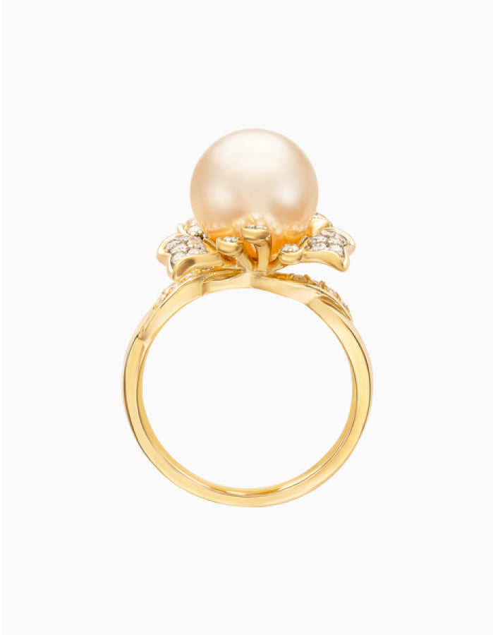Enhance your look for the next party with our stunning Daffodil Floral Inspired Ring that features a graceful 8 MM Round Golden South Sea Pearl in the center in bead setting. The Pearl is of AAA Quality and is set on the metal, decorated with round Diamonds that extend to the sides of the ring. This Floral Inspired Ring reflects the beauty of the South Seas. Treat yourself to the ultimate luxury by owning a piece of the world's best golden South Sea pearls, guaranteeing the highest quality with every purchase.